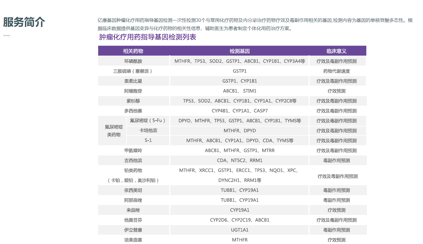 亿康基因肿瘤化疗用药指导基因检测一次性检测29个与常用化疗药物疗效及毒副作用相关的基因,检测内容为基因的单核苷酸多态性。根据临床数据提供基因变异与化疗药物的相关性信息,辅助医生为患者制定个体化用药治疗方案。